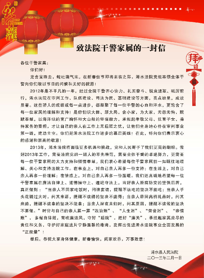 2013年,浠水法院将面临更多机遇和挑战,党和人民寄予了我们更高的期盼。做好2013年工作,需要法院党组一班人的率先垂范,需要全体干警的卓绝努力,更需要每一位干警家属的大力支持和倾情奉献。我们衷心希望每位干警家属能一如既往地理解、关心和支持法院工作。在事业上,对自己亲人再多一份支持;在生活上,对自己亲人再多一份理解;在情感上,对自己亲人再多一份温暖。我们还真诚地希望每一位干警家属在廉洁自律上、道德操守上、遵纪守法上,当好亲人拒腐防变的坚强后盾,真正做到:“当亲人不回家吃饭时,问谁宴请,提醒不该吃的坚决不能吃;当亲人手头花销过大时,问其来源,提醒不该得的坚决不能得;当亲人带回高档礼品时,问其来路,提醒不该拿的坚决不能拿;当亲人深夜未归时,问其原因,提醒不该做的坚决不要做。”时常与自己的亲人算一算“政治账”、 “人生账”、“荣誉账”、 “亲情账”, 多敲自律鼓,常吹廉洁风,守好“后院”,把好“廉关”,承担起家属应尽的责任和义务,守护好家庭这片宁静温馨的港湾,发挥出促进浠水法院事业全面发展的“正能量”!