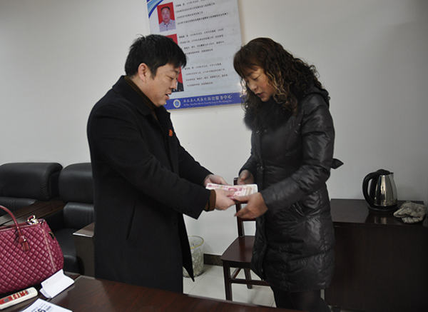 1月17日,浠水法院诉讼服务中心,法院执行工作人员周海斌将黄某等人按协议约定送来的第一批40000元赔偿款当面交到受害人家属缪女士手中,帮助受害人家属追回赔偿款取得实质进展。
