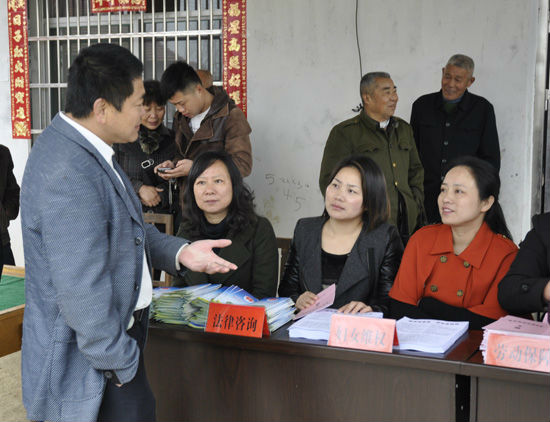 3月20日,浠水县法院妇委会主任章军梅在县妇联副主任徐静的带领下,与政法委、司法局等一行来到竹瓦镇古仁庵村,联合开展妇女维权下乡活动。