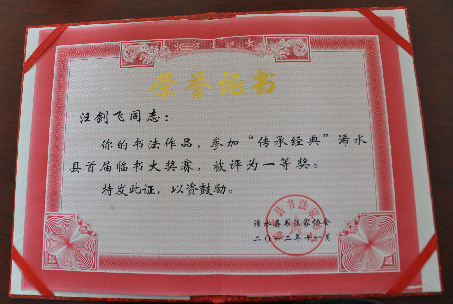 汪剑飞书法作品获浠水县首届临书大奖赛一等奖